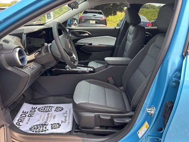 Marina Blue Metallic 2025 Chevrolet Trax LT FWD 6-Speed Automatic 1.2L I3 DI Turbocharged DOHC 12V LEV3-ULEV70 137hp 2-Way Adjustable Front Head Restraints, 3.50 Final Drive Axle Ratio, 4-Way Manual Front Passenger Seat Adjuster, 4-Wheel Disc Brakes, 6 Speakers, 6-Speaker Audio System Feature, 6-Way Manual Driver Seat Adjuster, ABS brakes, Adaptive Cruise Control, Air Conditioning, Alloy wheels, AM/FM radio: SiriusXM, Auto High-beam Headlights, Automatic temperature control, Brake assist, Bumpers: body-color, Cloth/Evotex Seat Trim, Compass, Delay-off headlights, Driver Confidence Package, Driver door bin, Driver vanity mirror, Dual front impact airbags, Dual front side impact airbags, Electronic Stability Control, Emergency communication system: OnStar One Essentials, Exterior Parking Camera Rear, Front and Rear All-Weather Floor Liners, Front and Rear Custom Molded Splash Guards, Front anti-roll bar, Front Bucket Seats, Front Center Armrest, Front Doors Keyless Open, Front reading lights, Front wheel independent suspension, Fully automatic headlights, Heated Driver and Front Passenger Seats, Heated Power-Adjustable Outside Mirrors, Heated Steering Wheel, Illuminated entry, Lane Change Alert with Side Blind Zone Alert, License Plate Front Mounting Package, Low tire pressure warning, LT Convenience Package, Occupant sensing airbag, Outside temperature display, Overhead airbag, Overhead console, Panic alarm, Passenger door bin, Passenger vanity mirror, Power door mirrors, Power steering, Power windows, Preferred Equipment Group 1LT, Premium audio system: Chevrolet Infotainment 3, Radio data system, Radio: AM/FM Stereo Audio System, Rear Cross-Traffic Alert, Rear Park Assist, Rear window defroster, Rear window wiper, Remote keyless entry, Security system, SiriusXM Trial Subscription, Speed control, Split folding rear seat, Spoiler, Steering wheel mounted audio controls, Tachometer, Telescoping steering wheel, Tilt steering wheel, Traction control, Trip computer, Variably intermittent wipers, Wheels: 17 Inch Gray-Painted Machined Aluminum Alloy, Wrapped Steering Wheel.